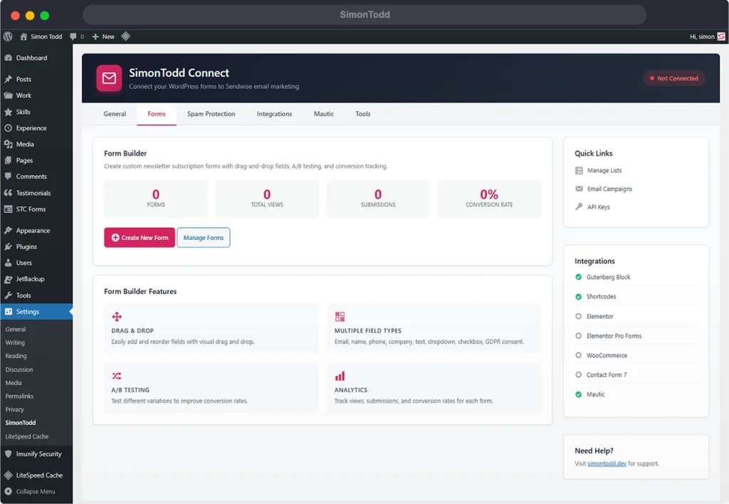 I’ve just released a major update to SimonTodd Connect, the WordPress plugin I use across all my client sites to handle newsletter signups and marketing automation. Version 2.0 brings some features I’ve been wanting to build for a while. Most notably a proper drag-and-drop form builder and built-in A/B testing.