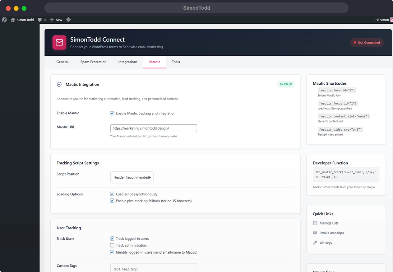 After years of cobbling together various newsletter plugins, email marketing integrations, and tracking scripts, I finally built the solution I actually needed. SimonTodd Connect is a lightweight WordPress plugin that brings together Sendwise (our email marketing platform) and Mautic marketing automation into a single, cohesive system.